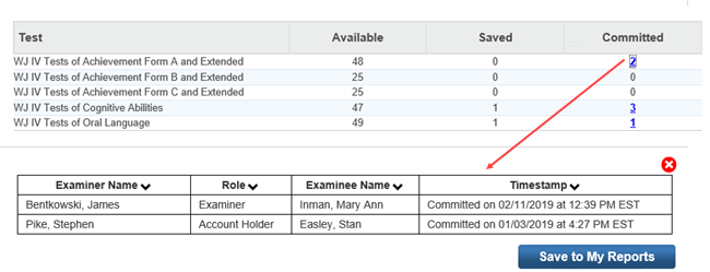 View the names, roles, and timestamps of examiners who have committed test records or who have been granted access to WIIIP and WMLS III interpretation and intervention tools