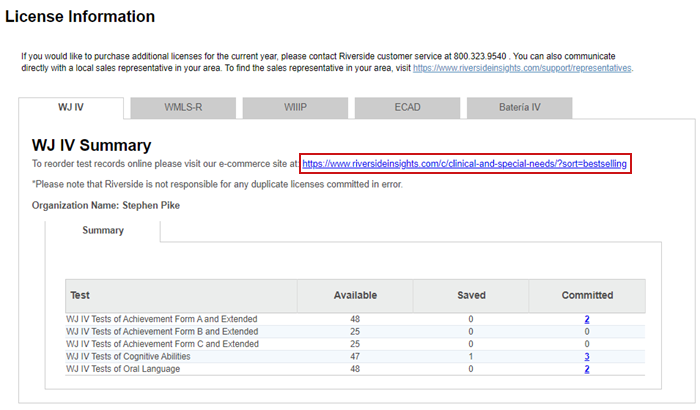 From the License Information page, click the Test Records link. The Woodcock Johnson Order page opens.