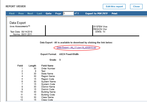 a file in a standard or custom template containing data on test results.