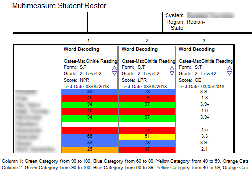 and values that color code the test results for each student.