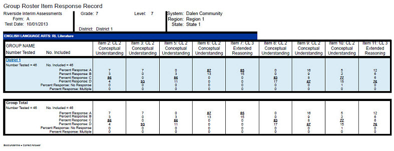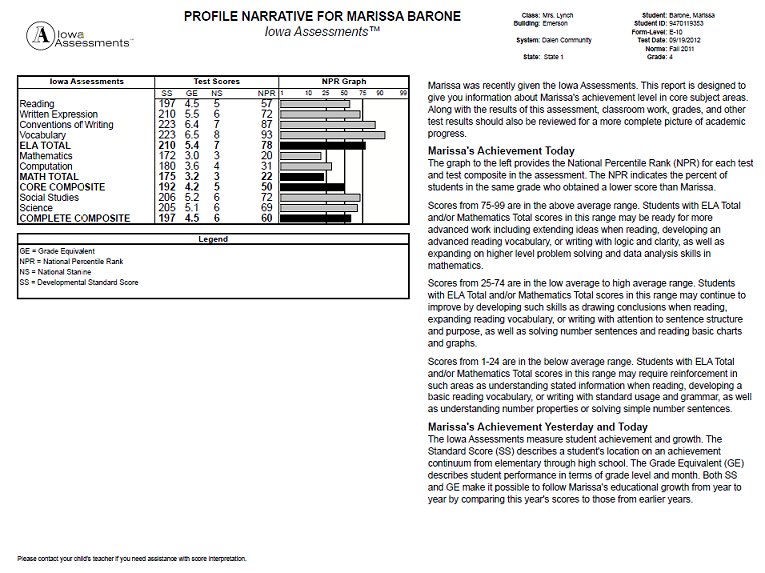 Provides test and composite scores or skill domain