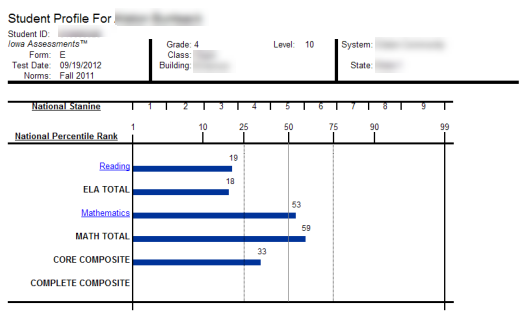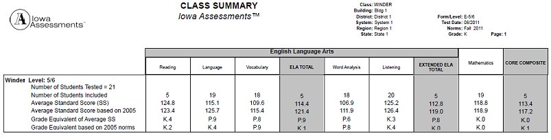 Provides scores by test and composite or skill