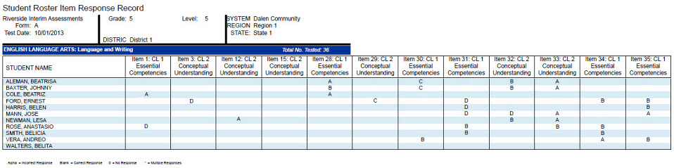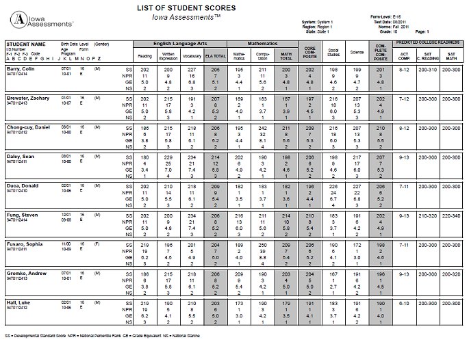 Provides a list of each student's test and composite