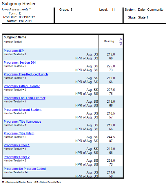 Provides test or composite scores for all subgroups